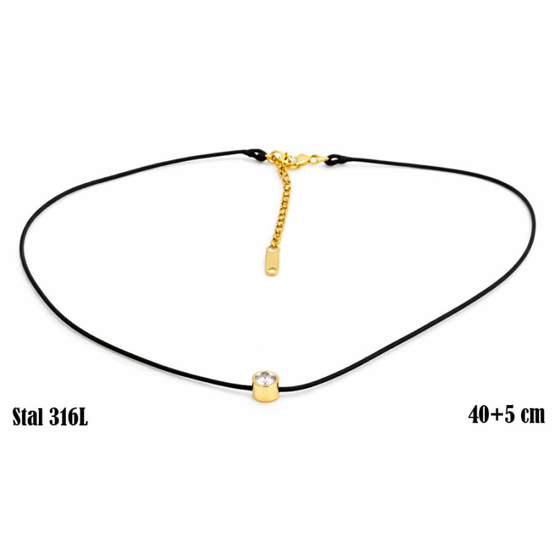 Stylowy naszyjnik łączy w sobie prostotę i nowoczesny design. Delikatny, czarny sznurek tworzy wyrazisty kontrast z elegancką, złotą oprawą kryształka, który subtelnie odbija światło i przyciąga uwagę.