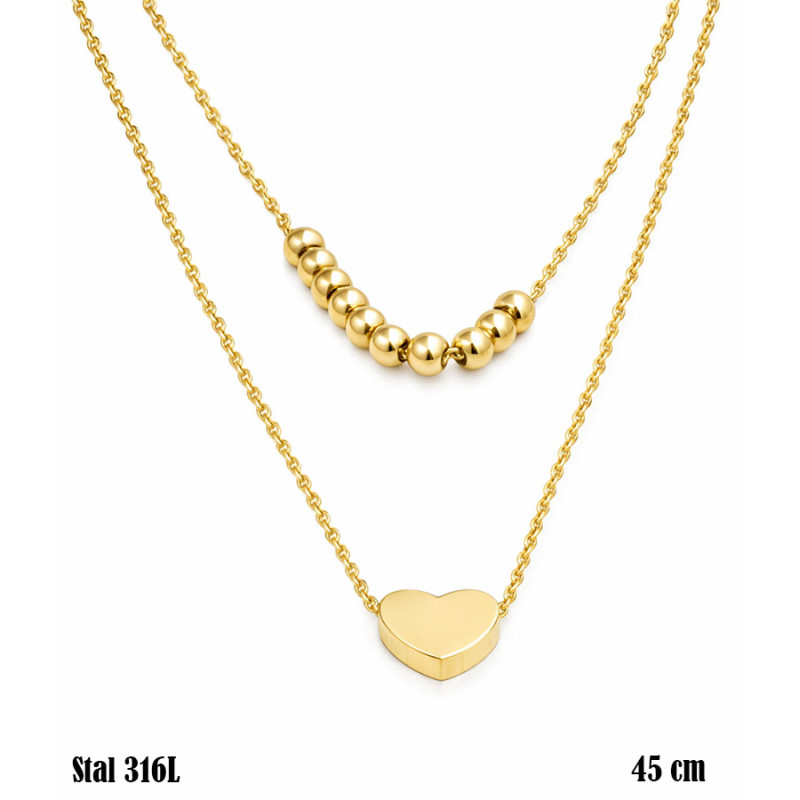 Podwójny łańcuszek w ciepłym, złotym odcieniu tworzy spójną i przyciągającą uwagę kompozycję. Krótsza warstwa ozdobiona jest rzędem gładkich, kulistych elementów, które nadają całości rytmu i delikatnego połysku. Niżej znajduje się drugi łańcuszek z zawieszką w kształcie serca o prostej, pełnej formie. Minimalistyczne wykończenie i wyważone proporcje sprawiają, że biżuteria prezentuje się lekko, a długość 45 cm pozwala na naturalne ułożenie obu warstw na szyi.