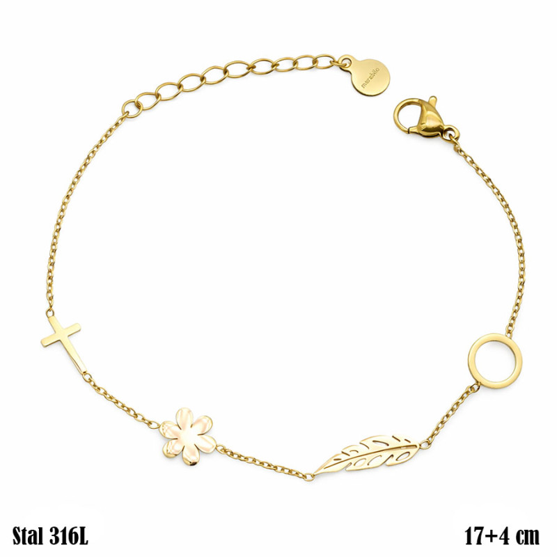 Subtelna bransoletka wyróżnia się lekką kompozycją ozdobnych elementów rozmieszczonych wzdłuż cienkiego łańcuszka w złotym kolorze. Wzdłuż bransoletki umieszczono kilka drobnych zawieszek o różnorodnych kształtach, które tworzą spójną i dekoracyjną całość. Widoczny jest smukły krzyżyk, niewielki kwiat o zaokrąglonych płatkach, ażurowy element przypominający liść oraz otwarty okrąg o minimalistycznej formie. Zestawienie pełnych i ażurowych kształtów nadaje biżuterii lekkości i podkreśla jej subtelny charakter. Smukły łańcuszek sprawia, że bransoletka prezentuje się elegancko i delikatnie na nadgarstku. Długość wynosi 17 + 4 cm, co umożliwia wygodne dopasowanie dzięki regulowanemu przedłużeniu.