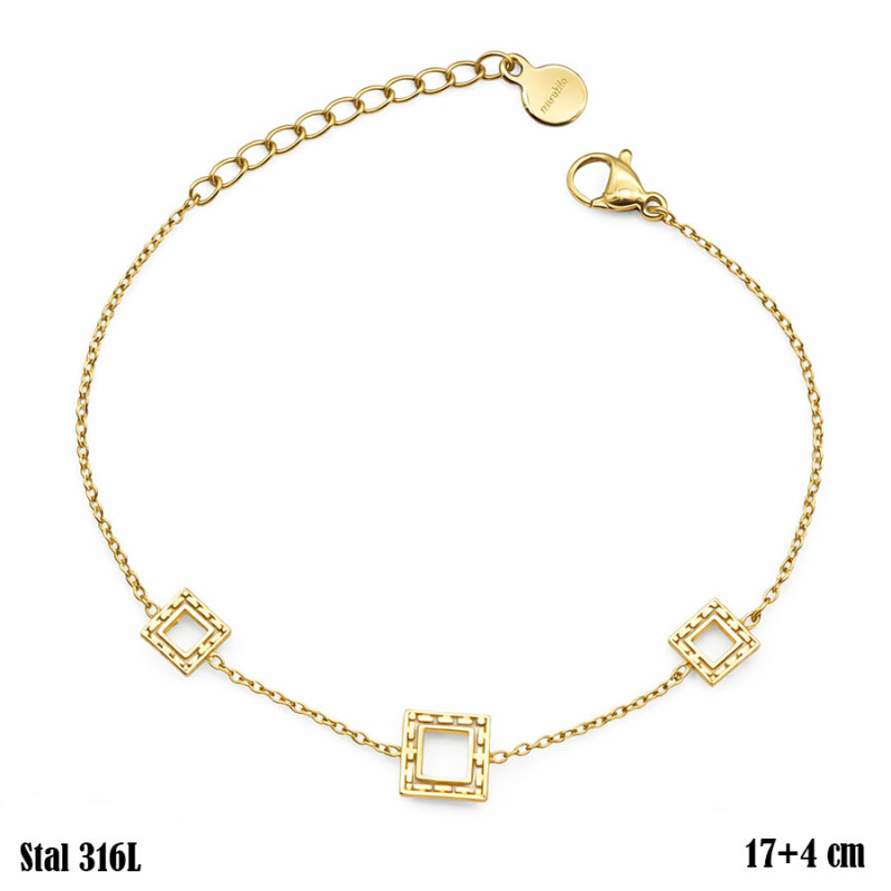 Delikatna bransoletka wyróżnia się uporządkowaną, geometryczną kompozycją elementów rozmieszczonych na cienkim łańcuszku w złotym kolorze. W centralnej części znajduje się ażurowy kwadrat o wyraźnym konturze, który stanowi główny punkt dekoracyjny całej formy. Po obu stronach umieszczono dwa mniejsze kwadratowe elementy utrzymane w tym samym stylu, dzięki czemu całość tworzy harmonijny i symetryczny układ. Delikatne wycięcia w obrębie kształtów podkreślają geometryczny charakter bransoletki i nadają jej lekkości. Smukły łańcuszek sprawia, że biżuteria prezentuje się subtelnie i elegancko na nadgarstku. Długość bransoletki wynosi 17 + 4 cm, co pozwala na wygodne dopasowanie dzięki regulowanemu przedłużeniu.