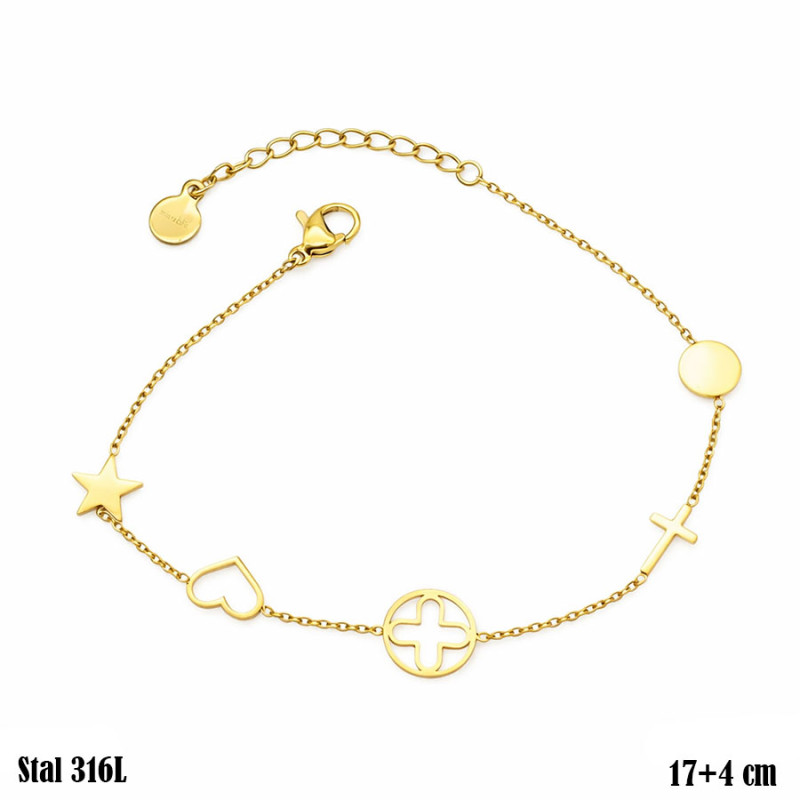 Subtelna bransoletka przyciąga uwagę dekoracyjnym układem drobnych elementów rozmieszczonych wzdłuż cienkiego łańcuszka w złotym kolorze. W centralnej części znajduje się okrągła zawieszka z wyciętym krzyżem, która stanowi główny punkt kompozycji. Wzdłuż łańcuszka rozmieszczono także inne detale: niewielką gwiazdkę, otwarte serce o delikatnym konturze, prosty krzyżyk oraz gładki, okrągły medalion. Zestawienie pełnych i ażurowych form nadaje biżuterii lekkości i tworzy harmonijną, symboliczną całość. Smukły łańcuszek sprawia, że bransoletka prezentuje się elegancko i subtelnie na nadgarstku. Długość wynosi 17 + 4 cm, co pozwala na wygodne dopasowanie dzięki regulowanemu przedłużeniu.