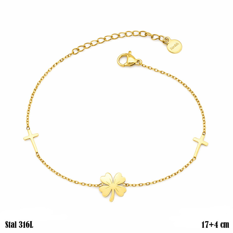 Delikatna bransoletka wyróżnia się minimalistyczną formą oraz harmonijną kompozycją drobnych elementów rozmieszczonych na cienkim łańcuszku w złotym kolorze. W centralnej części znajduje się czterolistna koniczynka o gładkiej powierzchni i miękkich krawędziach, która stanowi główny punkt dekoracyjny całej kompozycji. Po obu stronach umieszczono niewielkie krzyżyki o smukłej formie, które wprowadzają symetryczny układ i podkreślają subtelny charakter biżuterii. Cienki łańcuszek sprawia, że bransoletka prezentuje się lekko i elegancko na nadgarstku. Długość bransoletki wynosi 17 + 4 cm, co umożliwia wygodne dopasowanie dzięki regulowanemu przedłużeniu.