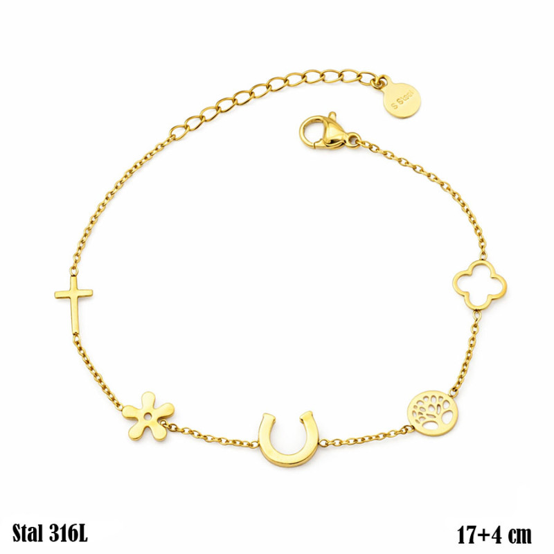 Delikatna bransoletka wyróżnia się kompozycją drobnych elementów rozmieszczonych wzdłuż cienkiego łańcuszka w złotym kolorze. W centralnej części znajduje się zawieszka w kształcie podkowy, która stanowi główny punkt dekoracyjny całej formy. Wzdłuż łańcuszka rozmieszczono także inne subtelne detale: niewielki krzyżyk, drobną zawieszkę o kształcie przypominającym kwiat, ażurowy motyw drzewa oraz otwartą formę czterolistnej koniczyny. Zestawienie tych elementów tworzy lekką, symboliczną kompozycję, która prezentuje się elegancko i subtelnie na nadgarstku. Długość bransoletki wynosi 17 + 4 cm, co pozwala na wygodne dopasowanie dzięki regulowanemu przedłużeniu.
