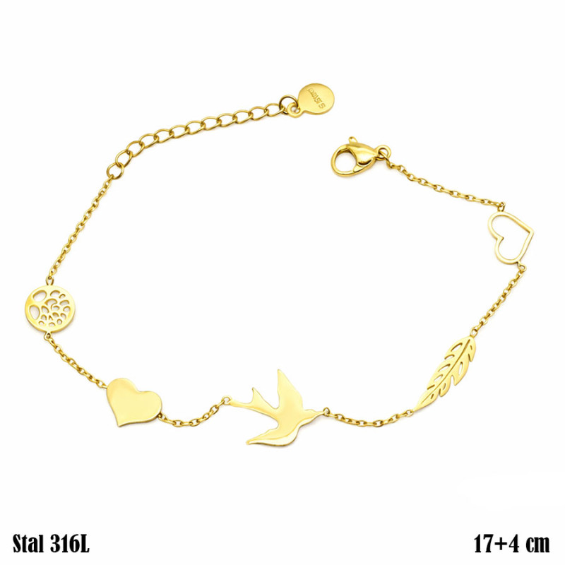 Delikatna bransoletka przyciąga uwagę lekką kompozycją drobnych elementów rozmieszczonych na cienkim łańcuszku w złotym kolorze. W centralnej części znajduje się zawieszka w kształcie jaskółki o rozpostartych skrzydłach, która stanowi główny punkt dekoracyjny całej kompozycji. Wzdłuż łańcuszka rozmieszczono także inne subtelne detale: gładkie serce o zaokrąglonej formie, otwarte serce o lekkim konturze, ażurowy motyw drzewa oraz dekoracyjny element przypominający liść. Zestawienie pełnych i ażurowych kształtów tworzy harmonijną całość, która nadaje bransoletce lekki, symboliczny charakter. Długość bransoletki wynosi 17 + 4 cm, dzięki czemu można wygodnie dopasować ją do nadgarstka dzięki regulowanemu przedłużeniu.