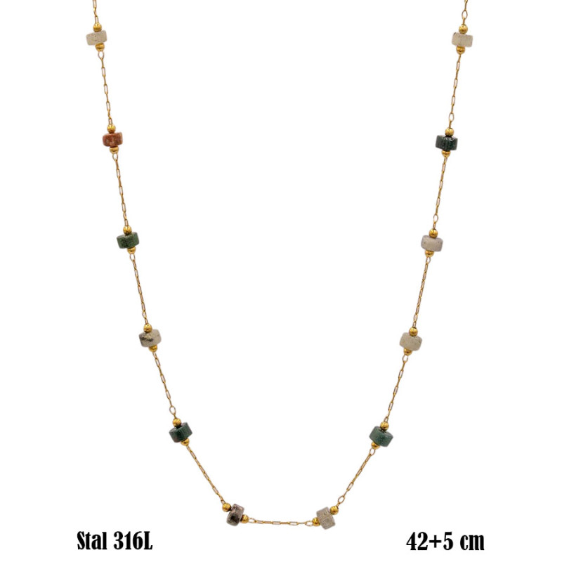 Delikatny naszyjnik w kolorze pozłacanym przyciąga uwagę lekką, wydłużoną formą. Cienki łańcuszek ozdobiono drobnymi kuleczkami oraz niewielkimi, cylindrycznymi elementami w zróżnicowanych odcieniach zieleni, beżu i brązu. Kompozycja jest rytmiczna i harmonijna, a złoty połysk łańcuszka podkreśla naturalny charakter wstawek. Długość 42 cm z przedłużką 5 cm pozwala dopasować naszyjnik do dekoltu i stylizacji.