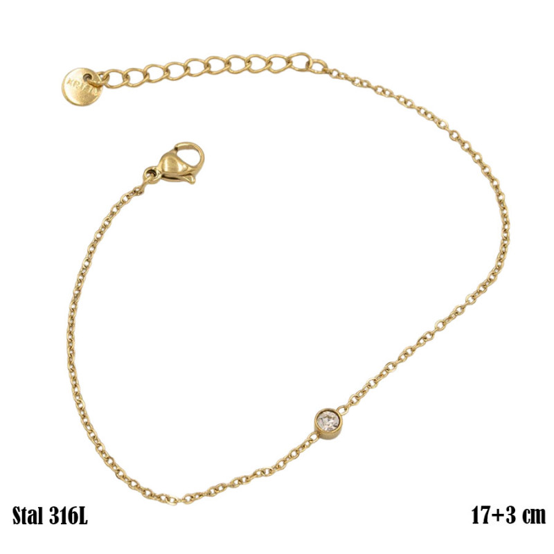 Cienka, pozłacana bransoletka przyciąga uwagę minimalistyczną formą i drobnym, okrągłym elementem z osadzoną cyrkonią. Smukły łańcuszek o klasycznym splocie delikatnie oplata nadgarstek, a centralny detal dodaje całości dyskretnego blasku. Prosta konstrukcja sprawia, że model prezentuje się lekko i elegancko. Długość 17 cm z przedłużką 3 cm umożliwia wygodne dopasowanie.