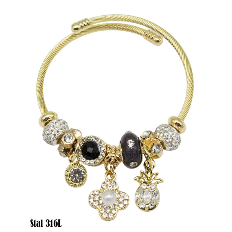 Sztywna bransoletka w kolorze złotym przyciąga uwagę bogactwem detali i starannie dobranymi elementami ozdobnymi. Skręcana obręcz tworzy elegancką bazę, na której umieszczono koraliki z drobnymi kryształkami, gładkie przekładki oraz ciemny, połyskujący moduł w centralnej części. Całość uzupełniają zawieszki: okrągła z kryształkiem, ażurowa koniczyna z perłowym środkiem oraz ananas wysadzany jasnymi kamieniami. Kompozycja jest efektowna, ale spójna, dzięki czemu bransoletka prezentuje się wyraziście i kobieco.
