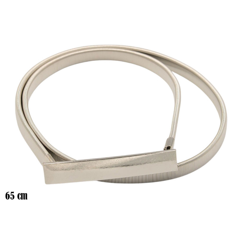 Ten pasek przyciąga uwagę prostą, geometryczną formą. Elastyczna sprężynkowa struktura w kolorze srebrnym tworzy spójną, gładką powierzchnię o subtelnym połysku. Całość uzupełnia prostokątna, metalowa blaszka, która nadaje modelowi wyrazisty, nowoczesny charakter. Długość 65 cm sprawia, że pasek dobrze układa się w talii i podkreśla sylwetkę bez nadmiernego obciążenia stylizacji.