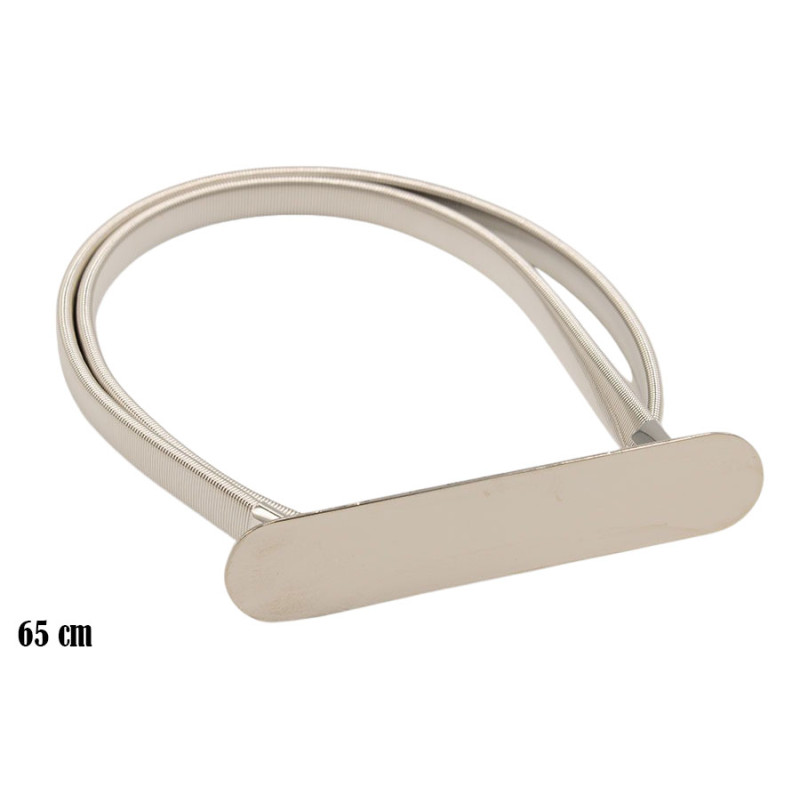 Elastyczny pasek o długości 65 cm wyróżnia się smukłą, sprężynkową strukturą w jasnym, srebrnym kolorze. Dwie cienkie linie tworzą harmonijną całość, która miękko układa się w talii. Centralnym elementem jest gładka, podłużna blaszka o zaokrąglonych krawędziach. Jej jednolita powierzchnia odbija światło i nadaje całości nowoczesny, uporządkowany charakter.