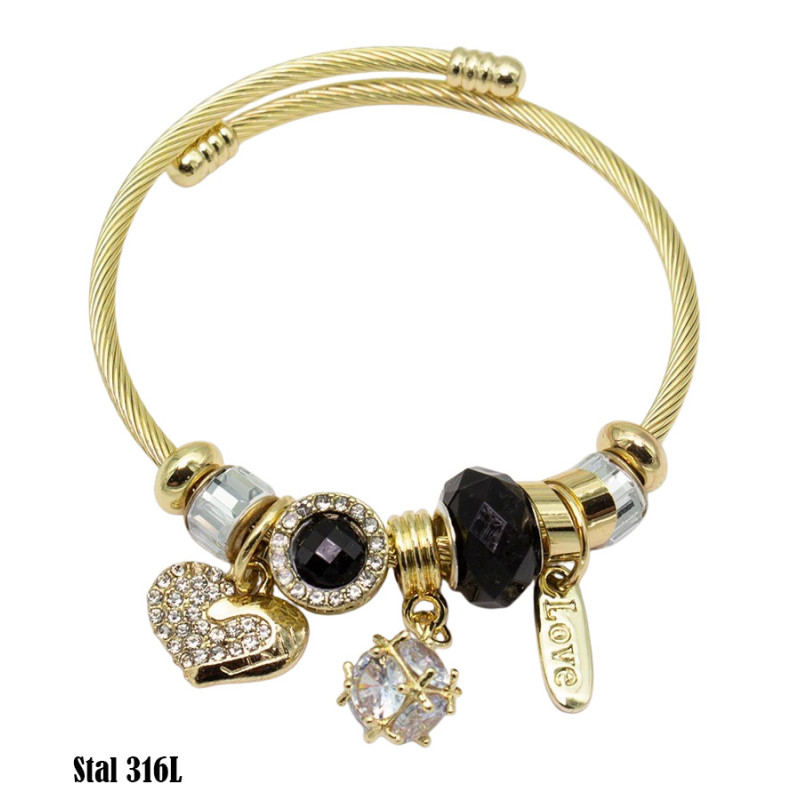 Bransoletka o sztywnej, skręcanej konstrukcji łączy złotą bazę z wyrazistymi, kontrastowymi detalami. Otwarta forma z dekoracyjnymi zakończeniami stanowi tło dla kompozycji koralików w czerni i transparentnym wykończeniu. Fasetowany, czarny element przyciąga światło głębokim połyskiem, a jasne, szlifowane akcenty wprowadzają optyczną lekkość. Całość uzupełniają zawieszki: serce wysadzane drobnymi kryształkami, okrągły detal z czarnym środkiem, przestrzenna kostka z transparentnym kamieniem oraz podłużna blaszka z napisem „Love”.