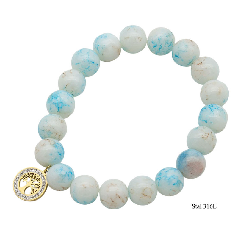 Stylowa bransoletka wykonana z naturalnych kamieni w odcieniach błękitu i bieli z delikatnymi żyłkami. Subtelna kolorystyka nadaje biżuterii lekkości i elegancji, dzięki czemu doskonale pasuje zarówno do codziennych, jak i bardziej eleganckich stylizacji.