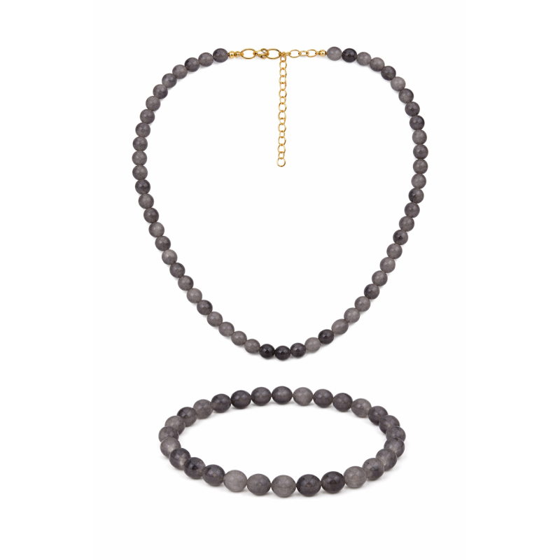Elegancki zestaw biżuterii wykonany z naturalnych kamieni iolitu w subtelnym odcieniu szarości z delikatnymi, przydymionymi refleksami. Komplet składa się z klasycznego naszyjnika oraz dopasowanej bransoletki z okrągłych, starannie polerowanych koralików, które pięknie podkreślają naturalną strukturę kamienia.