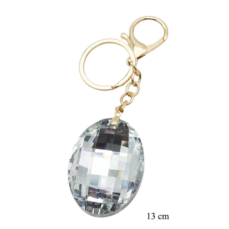 Elegancki brelok ozdobiony dużym, fasetowanym kryształowym kamieniem w transparentnym kolorze. Dzięki szlifowanej powierzchni kryształ pięknie odbija światło, tworząc efektowny i luksusowy wygląd.