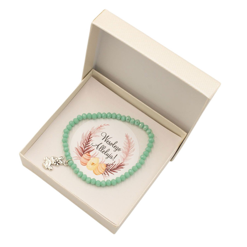 Delikatna bransoletka z drobnych, miętowych koralików zapakowana w eleganckie pudełko z kartą z napisem „Wesołego Alleluja”. Subtelny pastelowy kolor nadaje biżuterii świeżości i wiosennego charakteru, idealnie wpisując się w atmosferę Świąt Wielkanocnych.