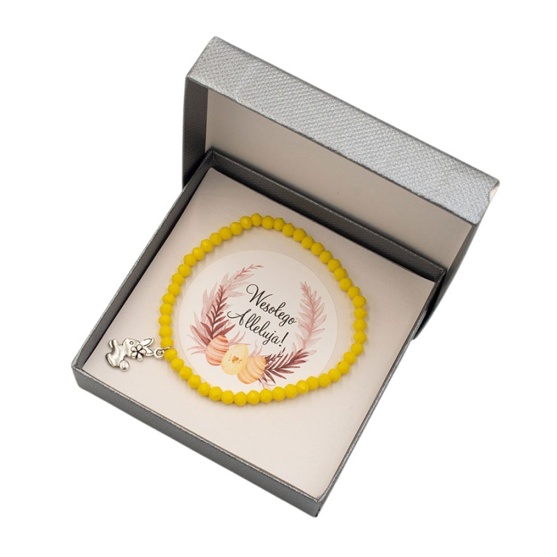 Radosna bransoletka z drobnych, żółtych koralików zapakowana w eleganckie pudełko z kartą z napisem „Wesołego Alleluja”. Intensywny, słoneczny kolor koralików doskonale oddaje wiosenny klimat i symbolikę radości związanej ze Świętami Wielkanocnymi.