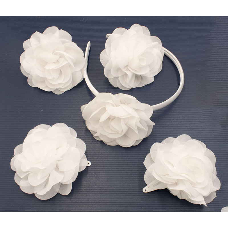 Elegancki zestaw ozdób do włosów w klasycznym białym kolorze, idealny na wyjątkowe okazje. Delikatne, materiałowe kwiaty nadają całości subtelnego i romantycznego charakteru, dzięki czemu komplet doskonale sprawdzi się jako dodatek do stylizacji komunijnych, weselnych lub innych uroczystości.