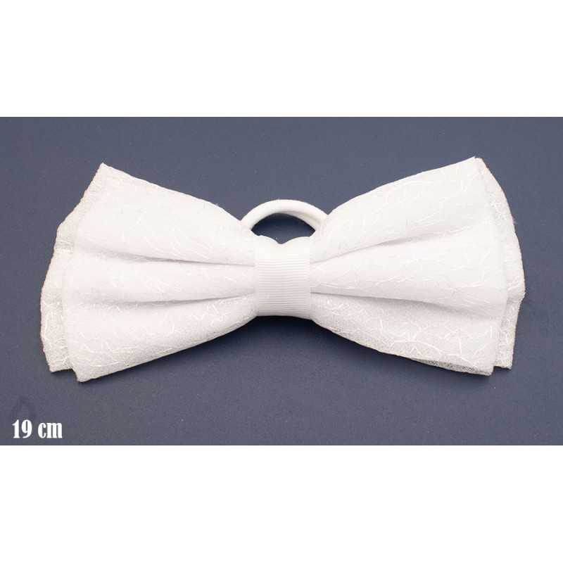 Stylowa gumka do włosów ozdobiona elegancką, dużą kokardą wykonaną z delikatnego materiału. Klasyczny biały kolor sprawia, że ozdoba doskonale pasuje do eleganckich i uroczystych stylizacji.