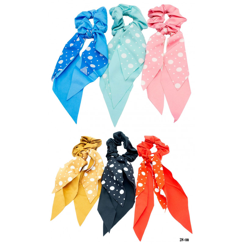 Stylowa gumka do włosów ozdobiona długą, dekoracyjną apaszką w modny wzór grochów. Dzięki eleganckiemu designowi gumka nie tylko utrzymuje włosy, ale także stanowi efektowną ozdobę fryzury.