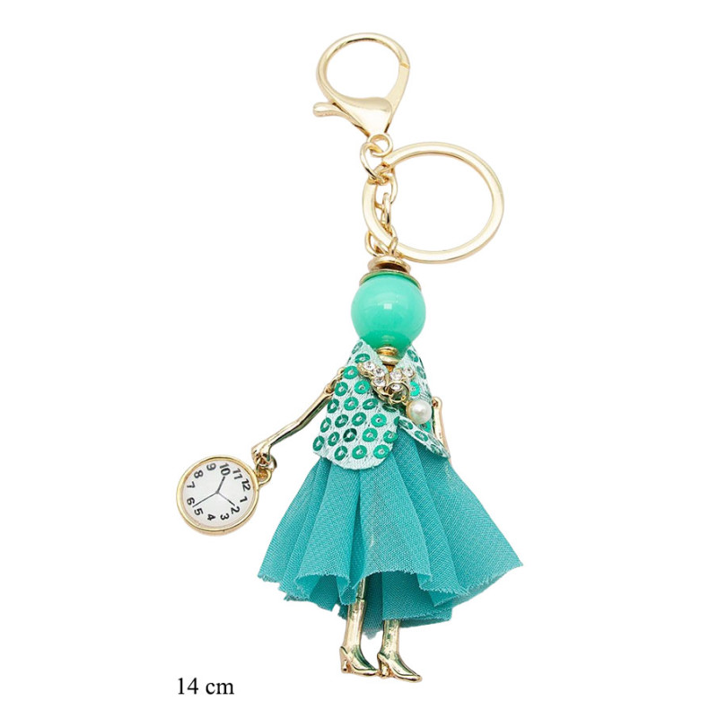Stylowy brelok do kluczy w formie figurki dziewczynki w eleganckiej turkusowej sukience. Ozdobiony błyszczącą kamizelką z cekinami, perełką oraz małą zawieszką w kształcie zegarka. Długie, ruchome nogi nadają brelokowi lekkości i oryginalnego charakteru.