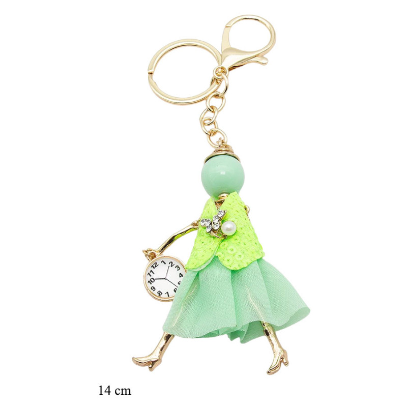 Modny i dekoracyjny brelok do kluczy w kształcie figurki dziewczynki w stylowej zielonej sukience. Ozdobiony błyszczącą kamizelką z kryształkami i perełką oraz małą zawieszką w formie zegarka. Długie, ruchome nogi nadają brelokowi lekkości i wyjątkowego charakteru.