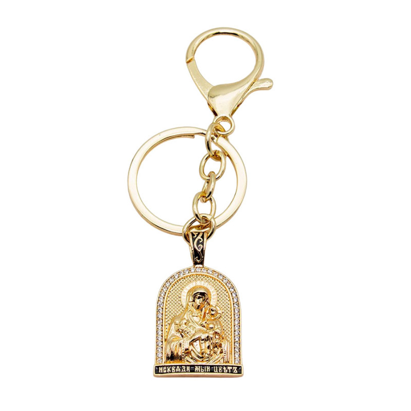 Elegancki brelok do kluczy z ozdobnym medalikiem przedstawiającym Matkę Boską z Dzieciątkiem. Zawieszka posiada dekoracyjną ramkę z drobnymi kryształkami, które dodają jej subtelnego blasku i elegancji. Złoty kolor sprawia, że brelok prezentuje się stylowo i wyjątkowo.