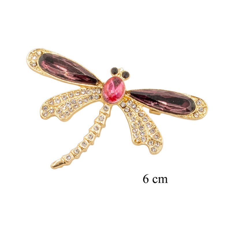 Elegancka broszka w kształcie ważki, wykonana w złotym kolorze i bogato zdobiona połyskującymi elementami. Skrzydła w głębokim, bordowo-fioletowym odcieniu pięknie kontrastują z delikatnie mieniącymi się cyrkoniami, które pokrywają korpus i dolne partie skrzydeł.