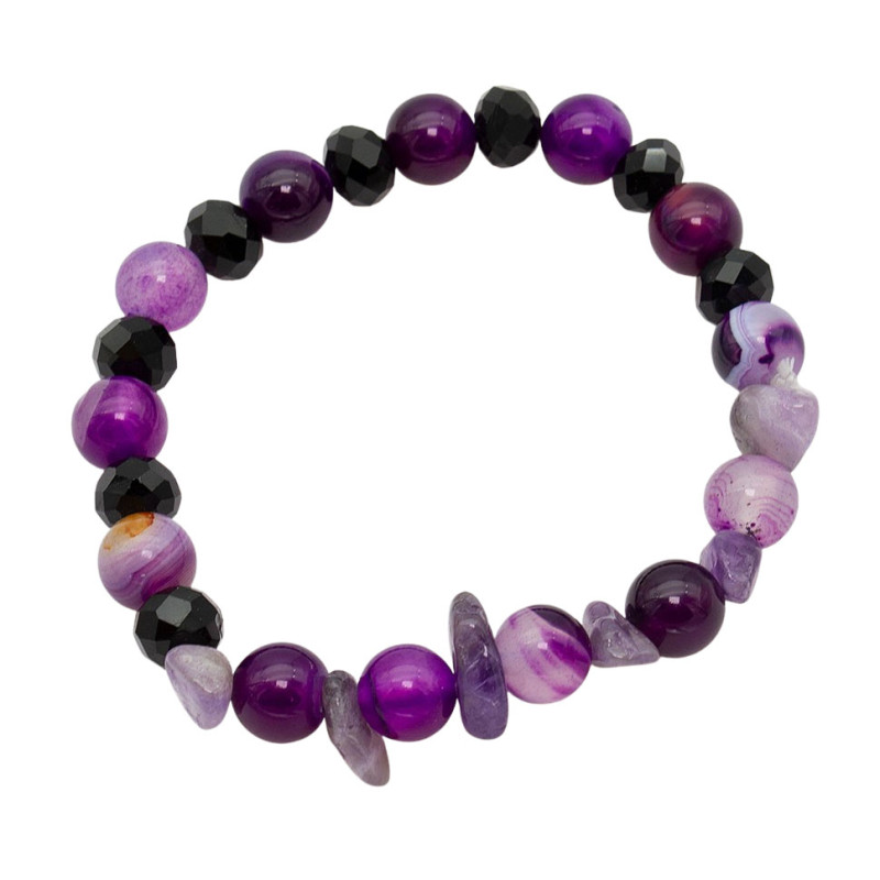 Widoczne delikatne żyłkowania i przejścia kolorystyczne nadają biżuterii unikalnego charakteru, dzięki czemu każda bransoletka prezentuje się niepowtarzalnie. Kontrast pomiędzy połyskiem czarnych elementów a subtelną strukturą fioletowych kamieni dodaje całości głębi i elegancji.