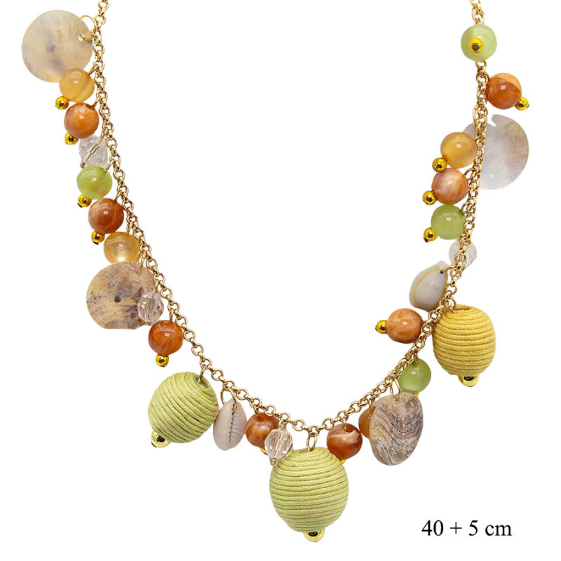 Efektowny naszyjnik w stylu boho, wykonany na delikatnym złotym łańcuszku i ozdobiony różnorodnymi zawieszkami. Kompozycja utrzymana jest w naturalnych odcieniach zieleni, beżu i ciepłych tonów karmelu, co nadaje biżuterii harmonijny i świeży wygląd.