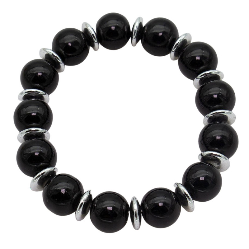 Stylowa bransoletka wykonana z gładkich, czarnych koralików o wysokim połysku, które nadają całości klasycznego i eleganckiego wyglądu. Między nimi umieszczono srebrne przekładki, które wprowadzają subtelny kontrast i dodają biżuterii nowoczesnego charakteru.