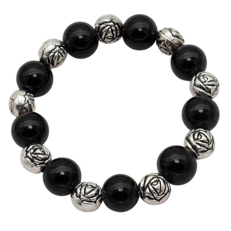 Elegancka bransoletka na gumce wykonana z czarnych, połyskujących koralików, przeplatanych ozdobnymi elementami w kształcie róż w kolorze srebrnym. Klasyczne połączenie czerni i srebra nadaje jej ponadczasowego i stylowego charakteru.
