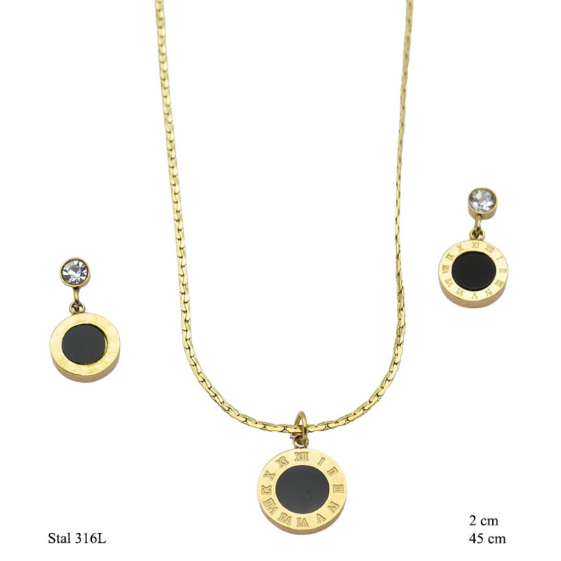 Elegancki zestaw biżuterii wykonany ze stali nierdzewnej 316L, składający się z naszyjnika oraz dopasowanych kolczyków. Ozdobą kompletu są okrągłe zawieszki z czarnym środkiem, otoczone subtelnym pierścieniem z grawerem rzymskich cyfr oraz delikatnym kryształkiem, który dodaje całości blasku.
