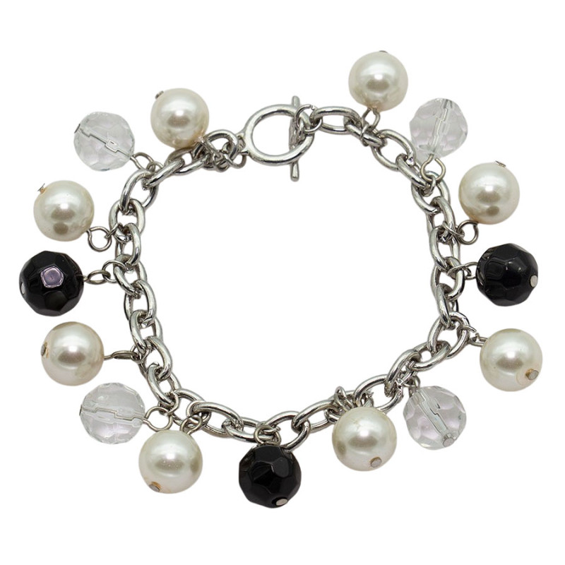 Stylowa bransoletka na łańcuszku ozdobiona wiszącymi zawieszkami, wśród których znajdują się eleganckie perełki oraz fasetowane koraliki w kolorze czarnym i transparentnym. Kontrast kolorów nadaje biżuterii nowoczesnego i wyrazistego charakteru.