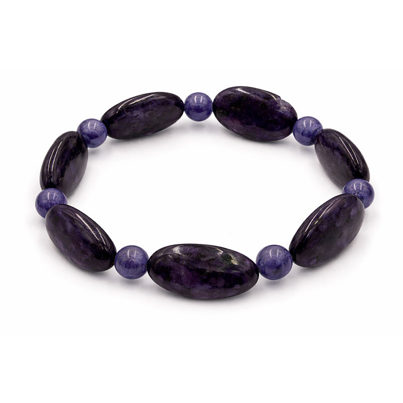 Elegancka bransoletka wykonana z kamieni w głębokim, fioletowym odcieniu, inspirowanych barwą ametystu. Zestawienie większych, owalnych elementów z mniejszymi, kulistymi koralikami tworzy harmonijną i efektowną kompozycję.