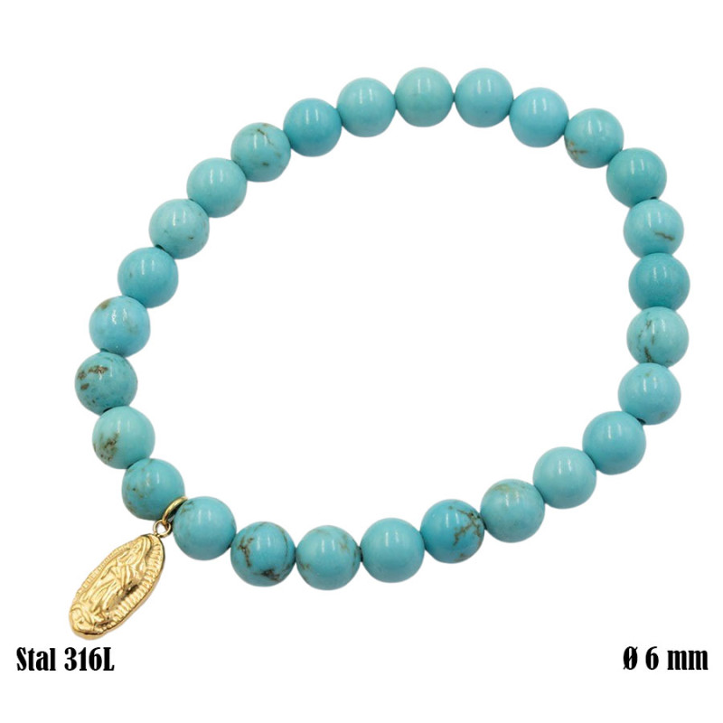Koraliki o średnicy ok. 6 mm tworzą subtelną i harmonijną kompozycję, idealną do codziennego noszenia. Całość uzupełnia złota zawieszka, która dodaje bransoletce elegancji i stanowi piękny kontrast dla turkusowej barwy.
