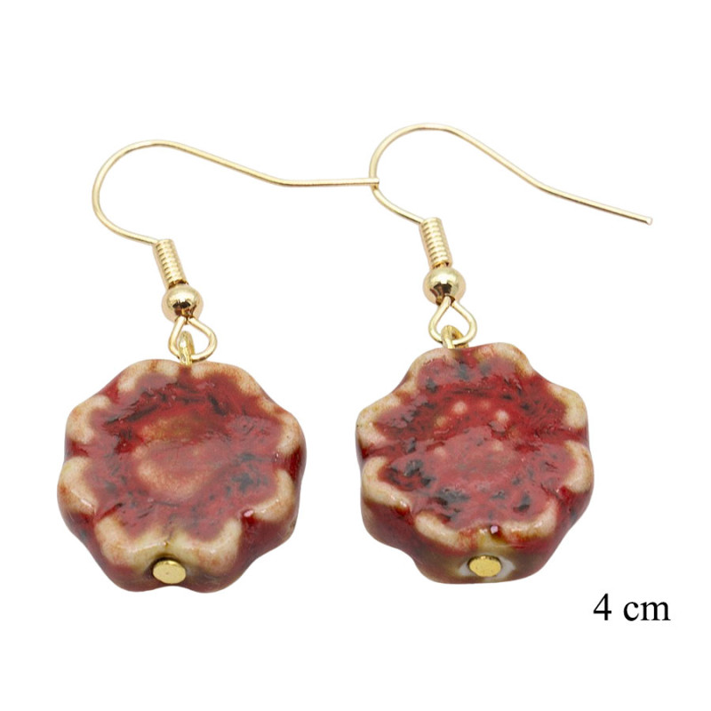 Kolczyki w formie zawieszki wyróżniają się intensywną kolorystyką i artystycznym wykończeniem. Głównym elementem jest stylizowany kwiat o nieregularnej, lekko fakturowanej powierzchni. Głęboki odcień czerwieni przeplata się z jaśniejszymi, beżowymi akcentami, tworząc efekt ręcznie zdobionej ceramiki o unikalnym charakterze.