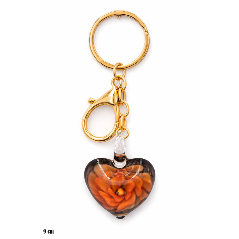 Efektowny brelok wyróżnia się dekoracyjną zawieszką w kształcie serca, wykonaną z transparentnego szkła o artystycznym wykończeniu. W jego wnętrzu widoczna jest kompozycja w intensywnych odcieniach pomarańczu, przeplatana ciemniejszymi tonami, co tworzy dynamiczny i przyciągający wzrok efekt.
