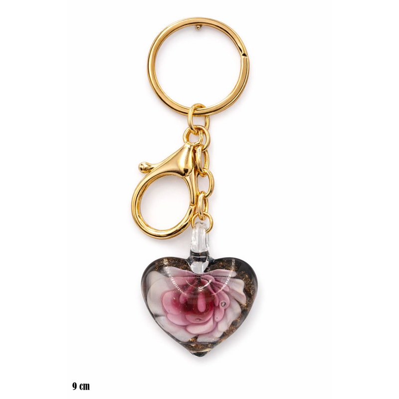 Stylowy brelok z dekoracyjną zawieszką w kształcie serca zachwyca delikatnym, artystycznym wzorem. W jego wnętrzu znajduje się kompozycja przypominająca kwiat w odcieniach różu i bieli, zatopiona w transparentnym szkle z subtelnymi, złotymi refleksami. Całość tworzy elegancki i romantyczny efekt.