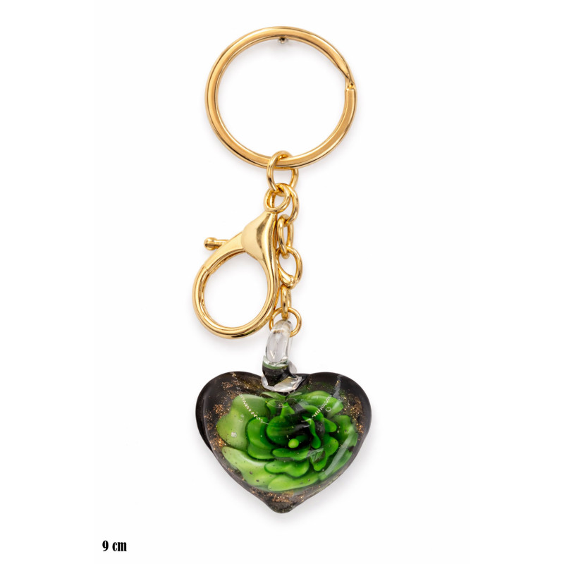 Oryginalny brelok z zawieszką w kształcie serca zachwyca wyjątkowym, artystycznym wnętrzem. W transparentnym szkle zatopiona została kompozycja przypominająca kwiat w intensywnych odcieniach zieleni, wzbogacona subtelnymi złotymi drobinkami. Całość tworzy świeży, energetyczny i nowoczesny efekt.