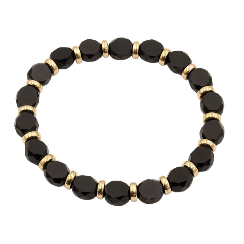 Stylowa bransoletka na gumce wykonana z czarnych, fasetowanych koralików, które łączą efekt półmatowy i półbłyszczący, tworząc ciekawy i nowoczesny kontrast. Całość uzupełniają złote przekładki, nadające biżuterii elegancji i wyrafinowanego charakteru.