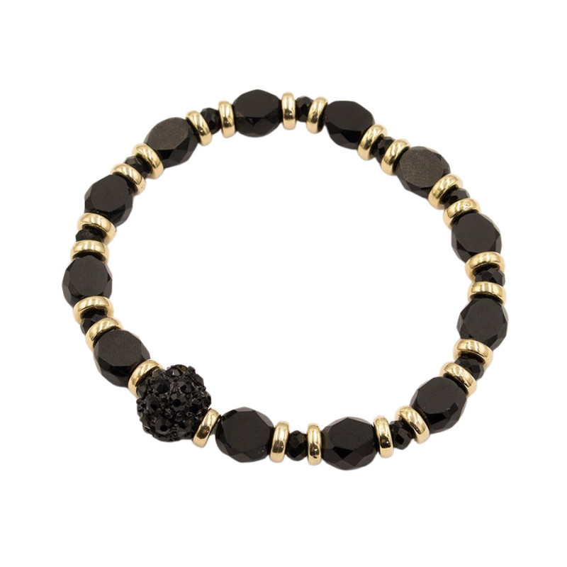 Elegancka bransoletka wykonana z czarnych koralików o zróżnicowanym wykończeniu – część z nich ma efekt matowy, a część subtelnie błyszczący, co tworzy ciekawy i nowoczesny kontrast.