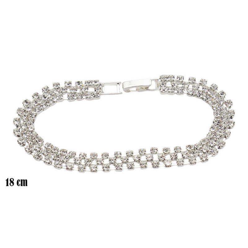 Bransoletka zachwyca lekką, rozświetloną formą złożoną z drobnych, transparentnych kamieni osadzonych w kilku rzędach. Jej ażurowa konstrukcja nadaje całości subtelności, a jednocześnie tworzy efekt bogatej, dekoracyjnej struktury. Jasna, chłodna kolorystyka pięknie odbija światło i dodaje stylizacjom świeżości. Model o długości 18 cm dobrze układa się na nadgarstku, tworząc spójną i komfortową formę.