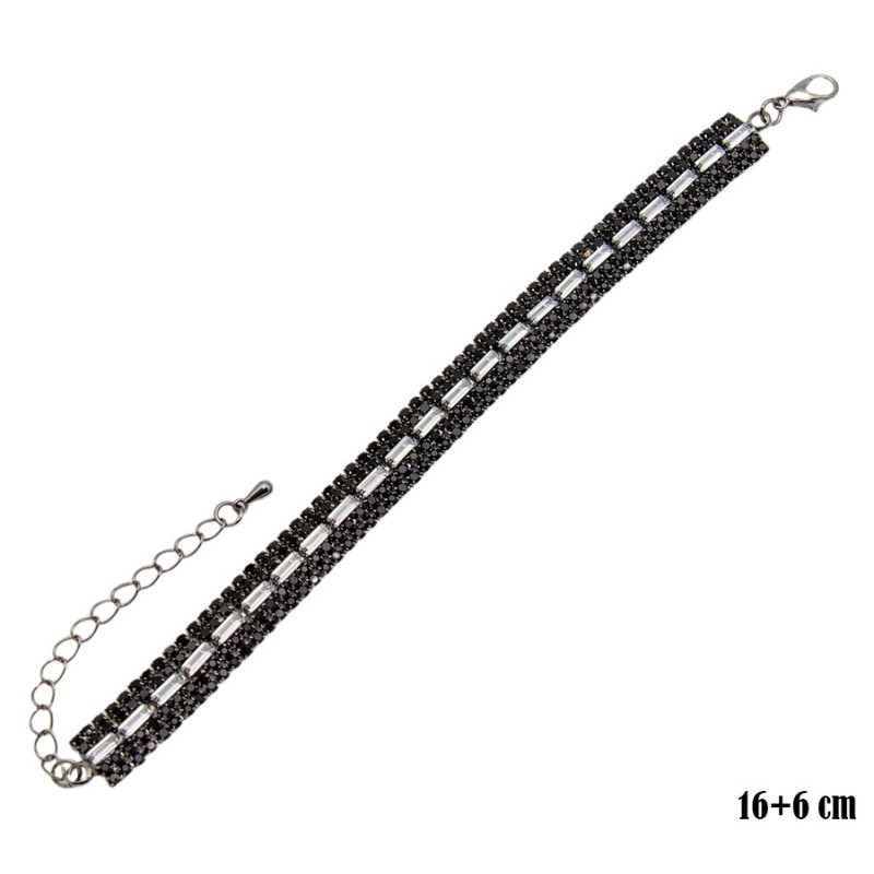 Bransoletka wyróżnia się wyrazistą, uporządkowaną formą, w której drobne, czarne kamienie tworzą gęstą, wielorzędową strukturę. Centralny pas z podłużnych, jasnych elementów wprowadza geometryczny rytm i przyciąga wzrok kontrastem. Całość prezentuje się nowocześnie, a jednocześnie zachowuje elegancki charakter. Głęboka czerń podkreśla wyrazistość kompozycji, a subtelny połysk dodaje jej lekkości. Długość 16+6 cm umożliwia regulację i dopasowanie do nadgarstka.