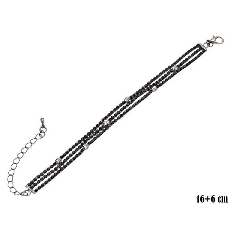 Bransoletka wyróżnia się lekką, wielopasmową formą złożoną z kilku cienkich rzędów drobnych, czarnych kamieni. Całość uzupełniają rozmieszczone w regularnych odstępach jasne elementy, które przełamują jednolitą strukturę i dodają kompozycji delikatnego kontrastu. Dzięki temu model zyskuje ciekawy, rytmiczny charakter, a jednocześnie pozostaje subtelny w odbiorze. Długość 16+6 cm pozwala na regulację i wygodne dopasowanie do nadgarstka.