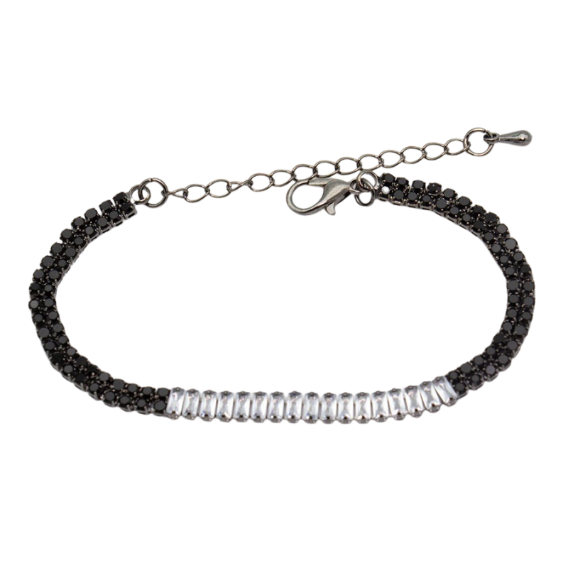 Bransoletka przyciąga uwagę harmonijnym połączeniem głębokiej czerni z jasnym, dekoracyjnym pasem umieszczonym centralnie. Drobne, czarne kamienie tworzą spójną, delikatnie zaokrągloną formę, która dobrze układa się na nadgarstku. Środkowy element z podłużnych, jasnych detali wprowadza kontrast i dodaje całości wyrazistości, jednocześnie zachowując elegancki charakter. Regulowane zapięcie z przedłużką pozwala na dopasowanie i wygodne noszenie.