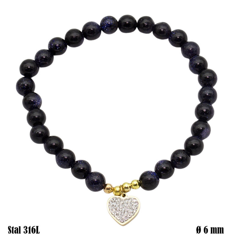 Bransoletka składa się z równych, okrągłych koralików o głębokim, niemal czarnym kolorze z delikatnie migoczącymi drobinkami, które przywodzą na myśl rozgwieżdżone niebo. Gładka, błyszcząca powierzchnia kamieni tworzy spójną i elegancką całość, a centralnym akcentem jest zawieszka w kształcie serca, wypełniona jasnymi, drobnymi kamieniami. Złociste detale przy zawieszce dodają kompozycji ciepłego kontrastu. Średnica koralików wynosi 6 mm, co zapewnia wyważony i uniwersalny wygląd.