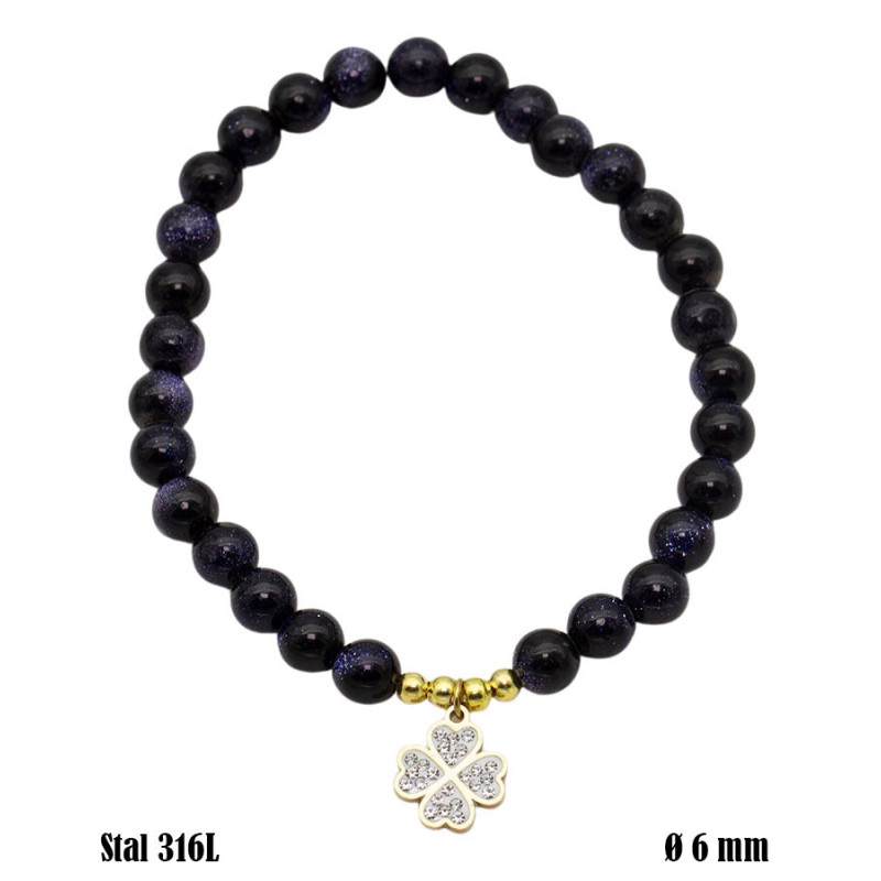 Bransoletka składa się z równych, okrągłych koralików w głębokim, ciemnym odcieniu z subtelnym, migoczącym efektem. Powierzchnia kamieni przypomina rozgwieżdżone niebo, co nadaje całości wyjątkowego charakteru. Centralnym elementem jest zawieszka w kształcie czterolistnej koniczyny, wypełniona drobnymi, jasnymi kamieniami, która przyciąga uwagę i wprowadza lekki kontrast. Złociste detale dodatkowo ocieplają kompozycję. Średnica koralików wynosi 6 mm, co zapewnia proporcjonalny i estetyczny wygląd.