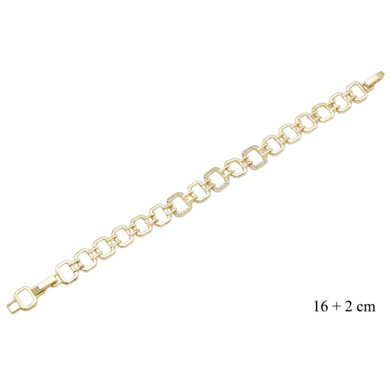 Bransoletka wyróżnia się ażurową konstrukcją złożoną z powtarzalnych, prostokątnych ogniw połączonych w rytmiczny, uporządkowany wzór. Gładkie elementy przeplatają się z delikatnie zdobionymi fragmentami, które subtelnie odbijają światło i wprowadzają lekki kontrast. Całość tworzy spójną, lekką wizualnie formę, która elegancko układa się na nadgarstku. Złocista kolorystyka nadaje biżuterii ciepłego charakteru i podkreśla jej nowoczesny styl. Długość 16+2 cm pozwala na dopasowanie.