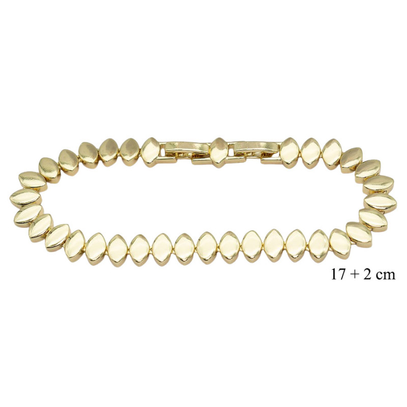Bransoletka przyciąga uwagę powtarzalnym układem drobnych, wydłużonych elementów o lekko zaokrąglonej formie. Każde ogniwo tworzy spójną, płynną linię, która miękko układa się na nadgarstku. Gładka, złocista powierzchnia subtelnie odbija światło, podkreślając regularność wzoru i nadając całości elegancki charakter. Kompozycja jest uporządkowana i wyważona, dzięki czemu model prezentuje się estetycznie zarówno w ruchu, jak i w spoczynku. Długość 17+2 cm umożliwia dopasowanie.