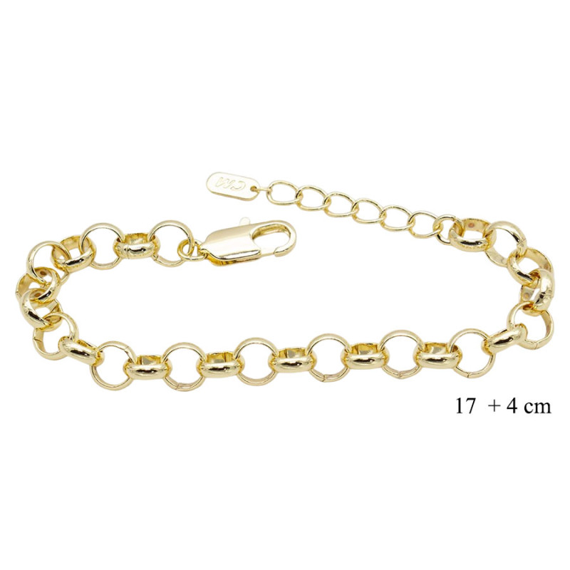 Bransoletka prezentuje prostą, ale efektowną formę opartą na regularnym splocie okrągłych i owalnych ogniw. Gładkie, zaokrąglone elementy tworzą spójną linię, która miękko układa się na nadgarstku i dobrze odbija światło. Złocista powierzchnia nadaje całości ciepłego charakteru, a przejrzysta konstrukcja sprawia, że model wygląda lekko i uniwersalnie. Długość 17+4 cm umożliwia regulację i dopasowanie do różnych rozmiarów.