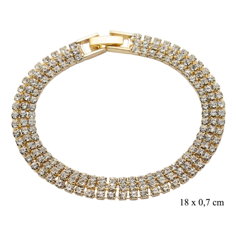 Bransoletka zachwyca bogatą, wielorzędową strukturą drobnych, jasnych kamieni osadzonych w złocistej oprawie. Gęste ułożenie elementów tworzy zwartą, dekoracyjną powierzchnię, która intensywnie odbija światło i nadaje całości wyrazisty charakter. Ciepły odcień złota podkreśla elegancję formy, a szerokość około 0,7 cm sprawia, że model prezentuje się bardziej zauważalnie na nadgarstku. Długość 18 cm zapewnia wygodne i stabilne dopasowanie.